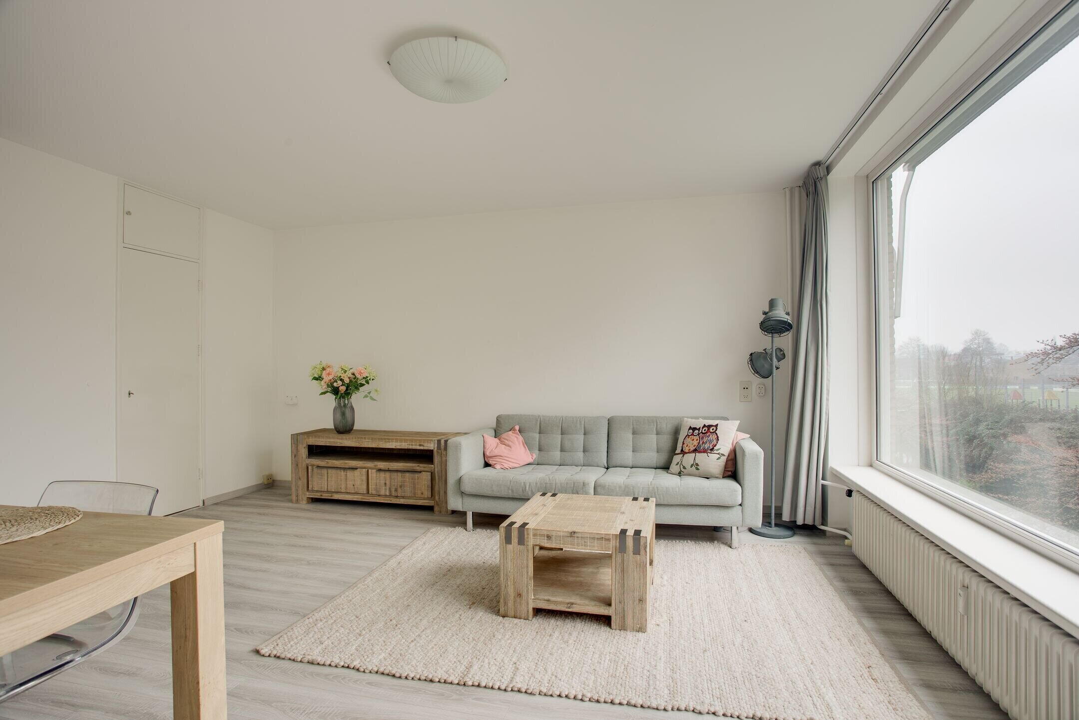 The spacious living room is characterized by large windows that provide plenty of natural light. The window frames in the living room are made of plastic and fitted with HR++ glass (2004). The floor is finished with laminate.